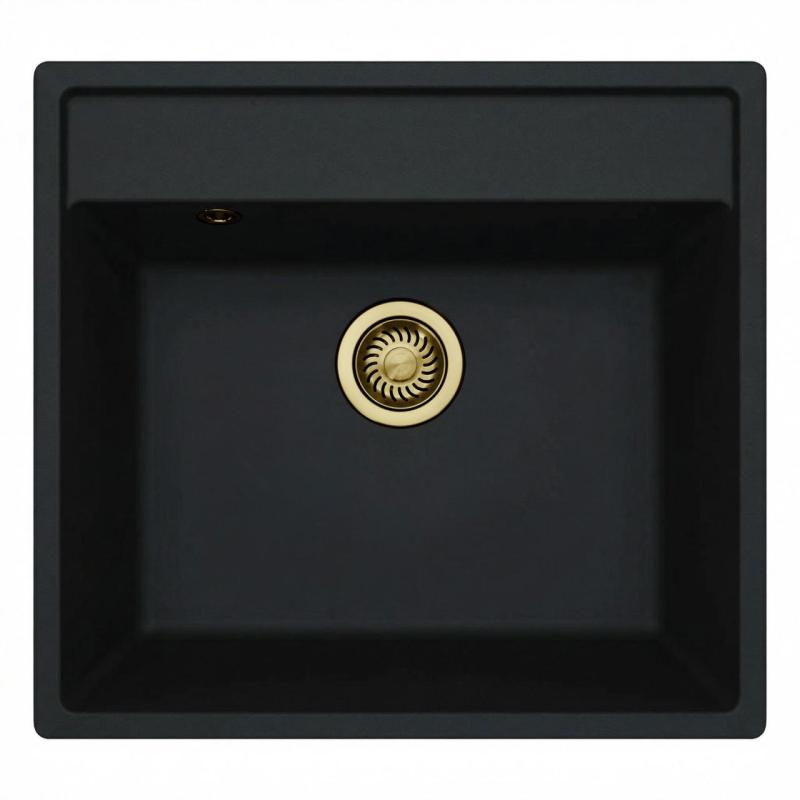 GraniteMy Bremen Fregadero de Granito 53x50 cm Negro – Instalación sobre encimera, bajo encimera y enrasada con banco de agujeros para grifo y tapón dorado 1208969969